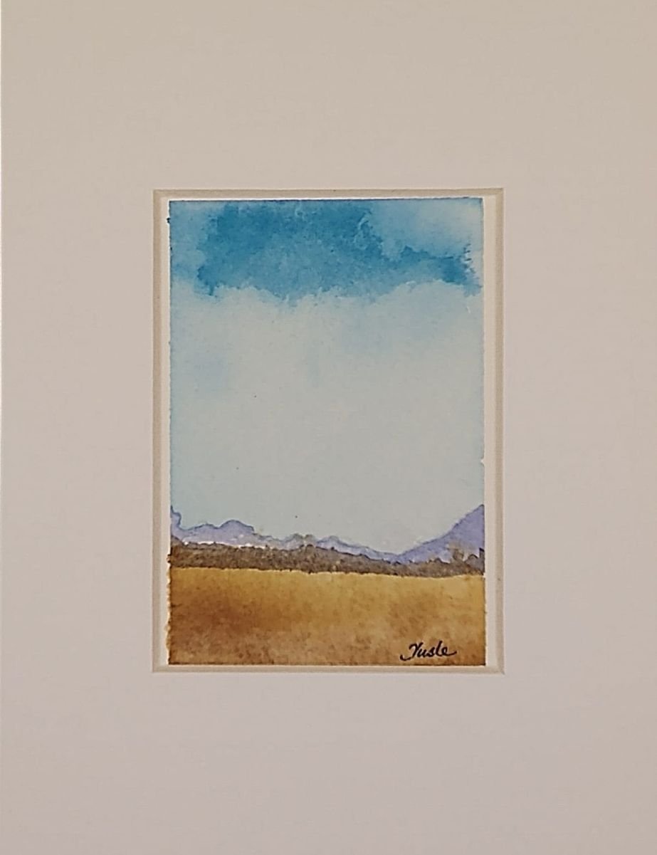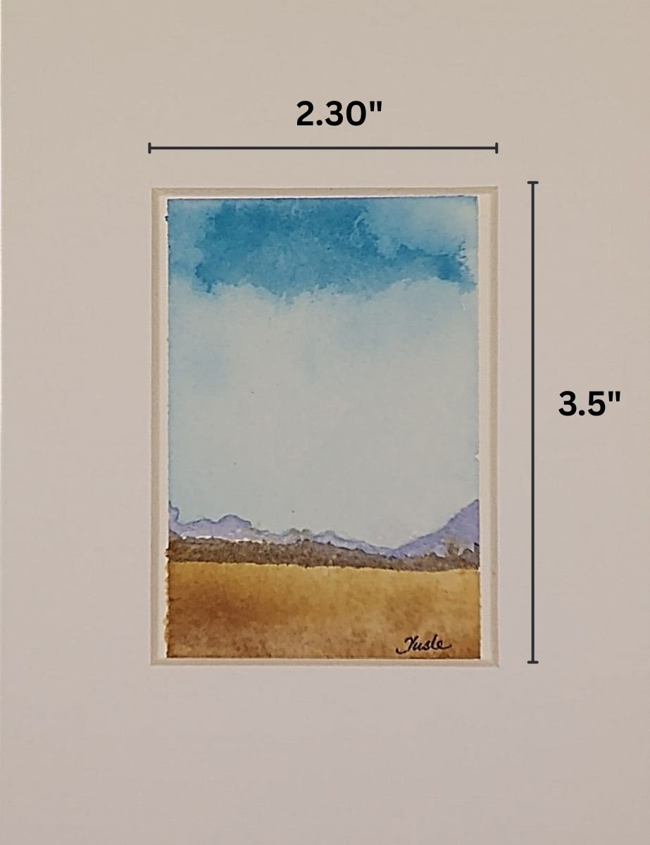This is a stunning miniature watercolor painting, measuring 2.30 x 3.5 inches, crafted with exquisite attention to detail, and ready to frame in a 5" x 7" frame. Painted on premium 140-pound Arches Cold Press paper, it features a harmonious blend of high-quality Winsor & Newton and Daniel Smith pigments. The landscape, evoking a tranquil scene of distant peaks under a boundless sky, is finished with a protective wax, ensuring its longevity and vibrance.