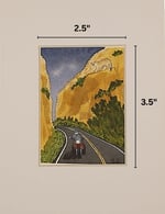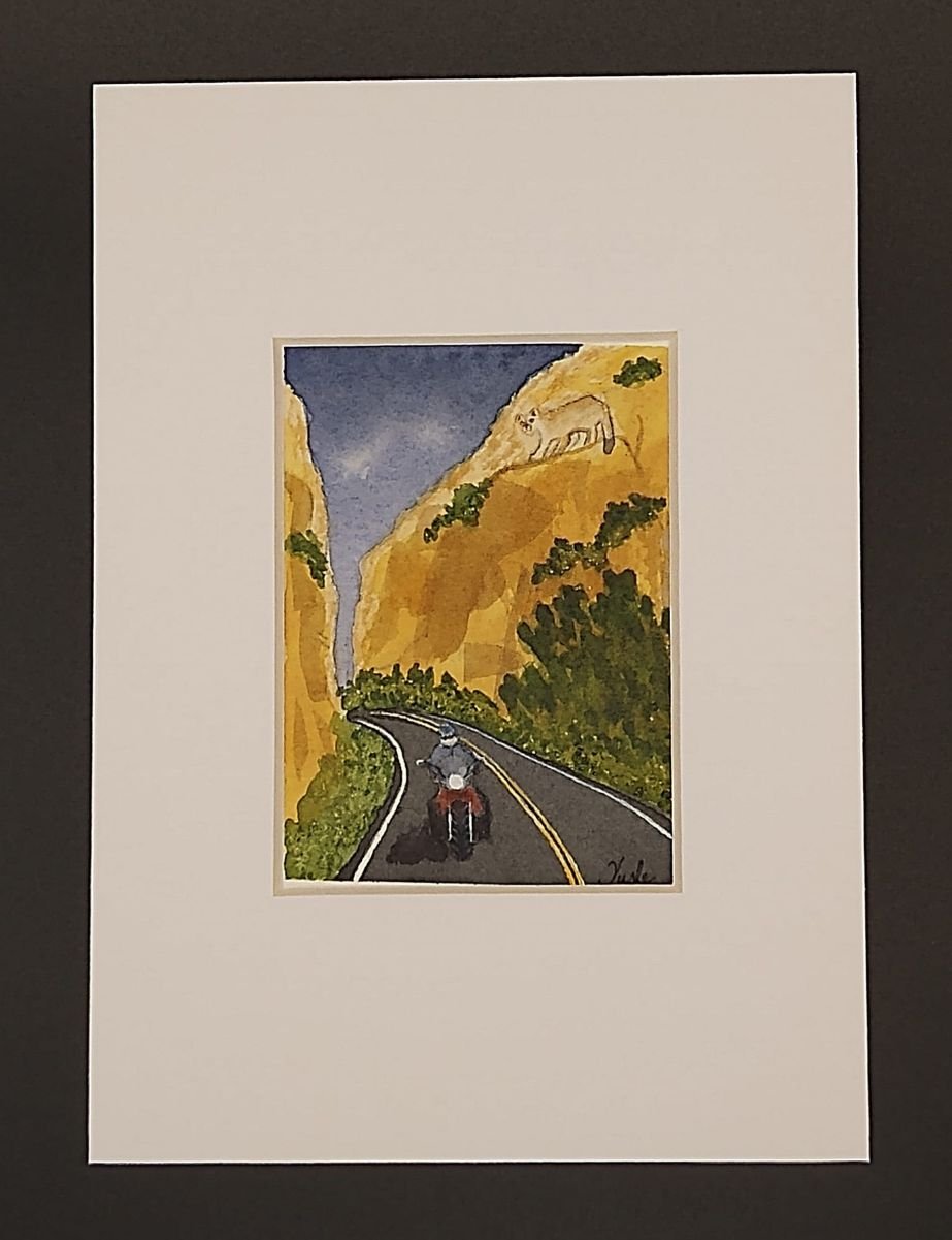 This one-of-a-kind miniature watercolor painting, measuring 2.5 x 3.5 inches, was created on 140-pound Arches Cold Press paper using premium Winsor & Newton and Daniel Smith pigments. The piece captures a lone motorcyclist riding along a winding desert road framed by towering golden canyon walls and deep green desert brush. High above the roadway, a mountain lion watches quietly from the rocky ledge, adding a sense of mystery, tension, and wild beauty to the scene. The dramatic contrast between the open road and the silent canyon guardian evokes both adventure and reverence for the untamed spirit of the Southwest.