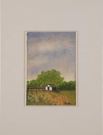 "Tranquil Solitude" is a miniature watercolor painting measuring 2.30 x 3.5 inches, created on 140-pound Arches Cold Press paper using high-quality Winsor & Newton and Daniel Smith pigments. This original artwork captures a serene Southwestern landscape, featuring a solitary house nestled among valleys and a vast, cloud-filled sky. The soft washes of color and delicate brushwork evoke a sense of peace and tranquility. This is a one-of-a-kind (OOAK) artwork; no prints are available for this original painting.