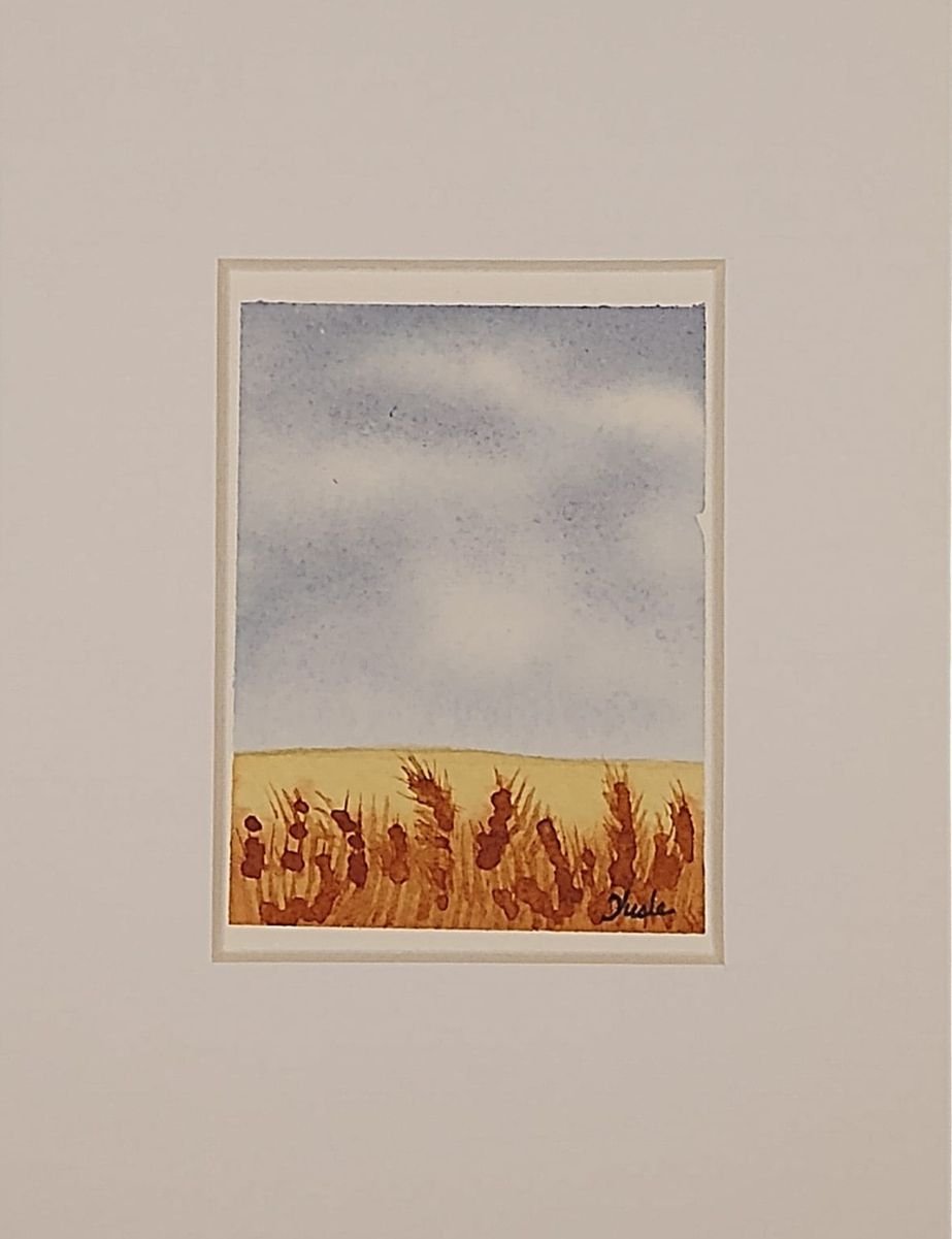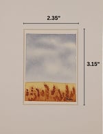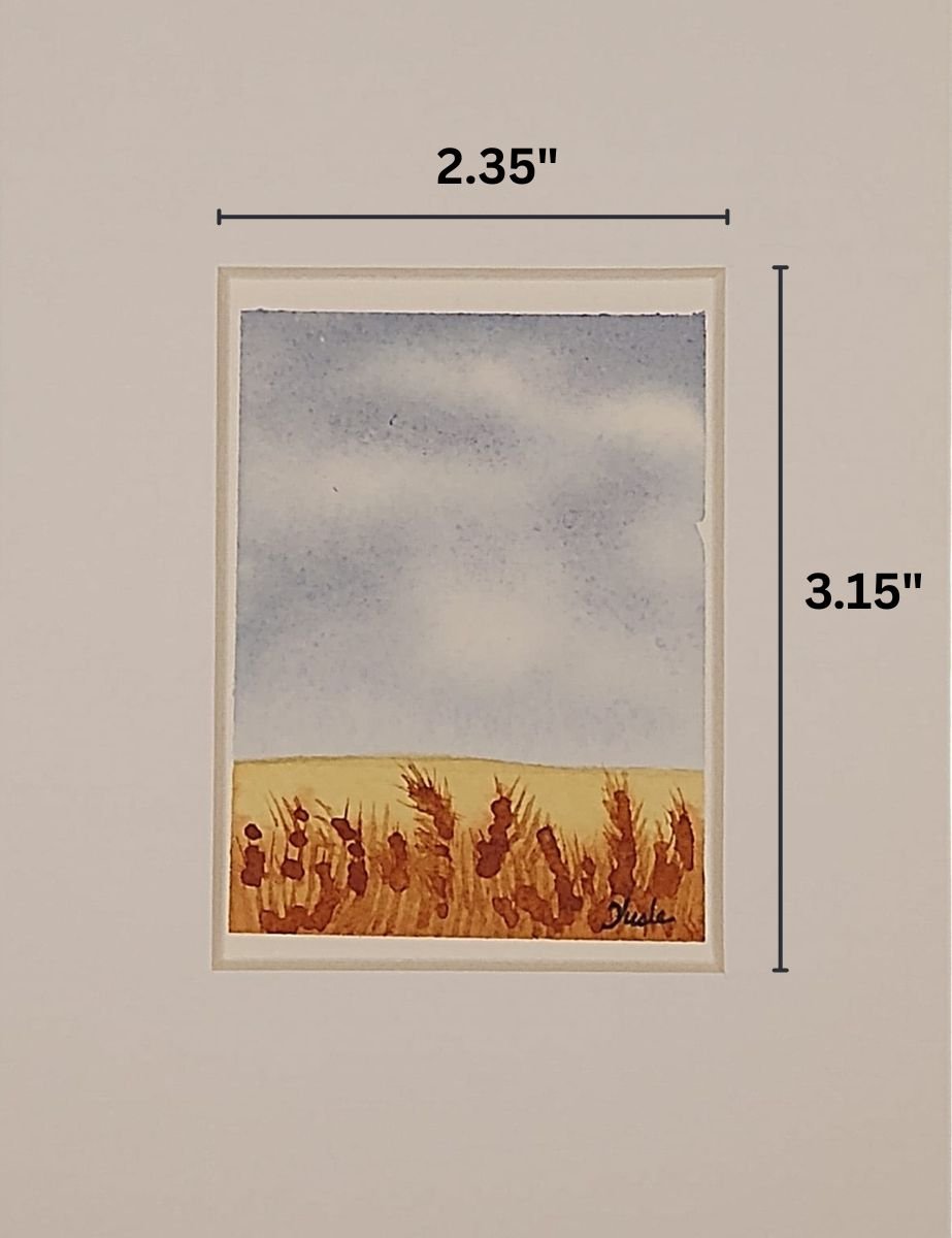 This one-of-a-kind miniature watercolor painting, measuring 2.35 x 3.15 inches, was created on 140-pound Arches Cold Press paper using premium Winsor & Newton and Daniel Smith pigments. The composition captures a quiet, open landscape beneath a soft blue sky, where golden grasses and delicate seed heads sway across the foreground. With its minimal forms and warm, earthy tones, the piece evokes a sense of stillness, simplicity, and the quiet poetry of a windswept plain.